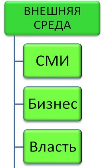 Добавим к этому, что группы от «получателей услуг» до представителей СМИ, власти и бизнеса, составляют по отношению к НКО внешнюю среду. Логика выделения этих групп основывается на интенсивности их контактов и степени близости к деятельности НКО.