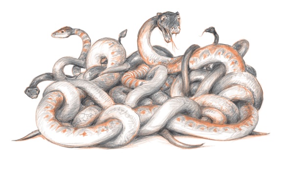 Суть гады двоякого роду. Одних мы именуем колубрами (colubras), поелику живут оне среди тени (colat imbras), других же – серпентами (serpentes), сии ползают (serpunt, по-гречески herpein). Все ядом убивают и преразличнейшими творят это способами. К примеру, ежели укусит dissa, то укушенный умирает от жажды (sitis). Яд hypnalis’а в сон вечный тихо погружает, как то случилось с царицею Клеопатрою, коя именно гипналисом воспользовалась, дабы умереть без мук. Hemorosis тем убивает, что у человека, им укушенного, жилы лопаются и кровь (по-гречески hema) вся из него вытекает. У kerastis’а же на голове растут рога (по-гречески keraste), как у барана, и он в песок по самые эти рога закапывается и проходящих неожиданно в яйца кусает.