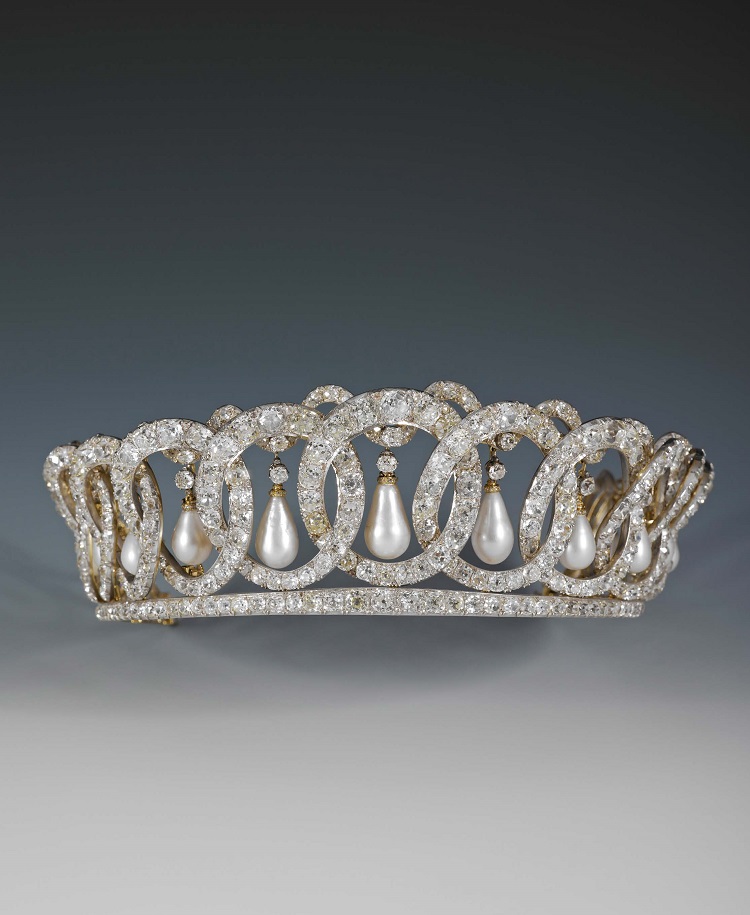 The Vladimir Tiara is made up of fifteen intertwined diamond-set ovals from which hang pendant pearls. The pearls can be interchanged with emeralds.