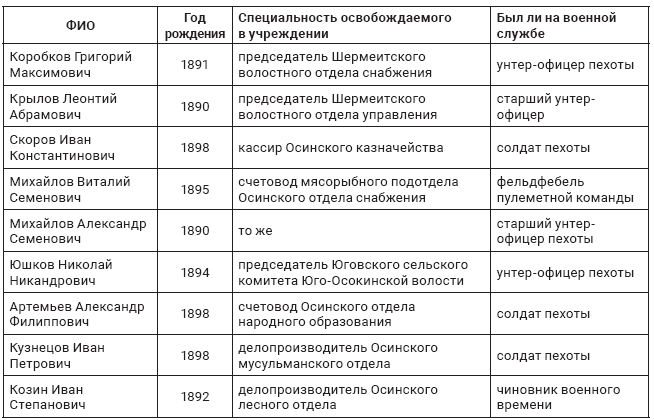 И хоть это не означало освобождение от службы полностью, а лишь предоставляло отсрочку, сразу же после выхода декрета уездные военкоматы начали получать множество ходатайств об освобождении «незаменимых работников». Иногда списки составлялись раньше, чем выходил приказ о мобилизации. В них говорилось: «освобожден приемщиком по ходатайству продовольственного отдела», «освобожден по ходатайству партии коммунистов», «собранием волостного совета рабочих и крестьянских депутатов», «коммуной слесарей и кузнецов», «кожевенным подотделом», «почтовым отделением»136. Все, кто занимал какую-либо должность в советских и прочих учреждениях и организациях, подлежали освобождению: работники военкоматов, председатели и секретари отдела снабжения, председатели и секретари комитетов бедноты, лесные сторожа, лесообъездчики, учителя, транспортные служащие137. При этом до службы в занимаемой должности почти все они участвовали в мировой войне и почти все получили освобождение138.