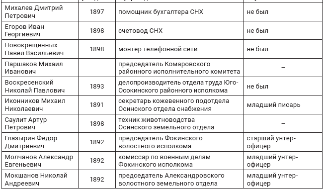 Аспинский волостной исполком составил список должностных лиц, подлежащих мобилизации, которых, по его мнению, следовало от нее освободить145.