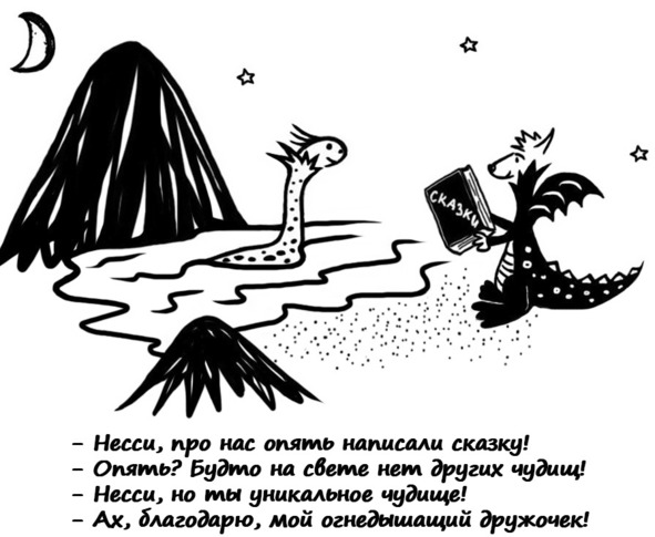 Ещё в этой книге обитают два волшебных существа: дракон и Лох-несское чудище. Они давнишние закадычные друзья. Вот полюбуйтесь-ка на них.