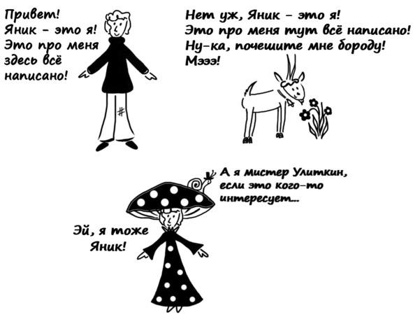 Ах, нет, мы же забыли про Яника! Он обычный школьник, хотя на некоторых рисунках вид у него не очень-то обычный. А что поделать, сам виноват! Зачем он без спроса залез в избушку ведьмочки? Вот не залез бы и не было бы его в этой истории, сидел бы себе в школе и ворон считал в своё удовольствие.
