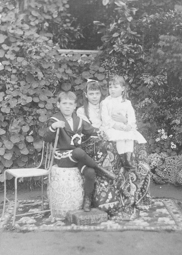 Александр III поливает деревья из шланга, рядом сын Михаил и дочь Ольга. 1888 год