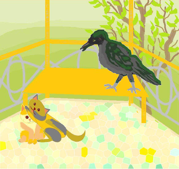 Подойдя к беседке, котенок увидел, что его сестричка Малышка забилась в угол, а к ней приближается огромная страшная ворона.