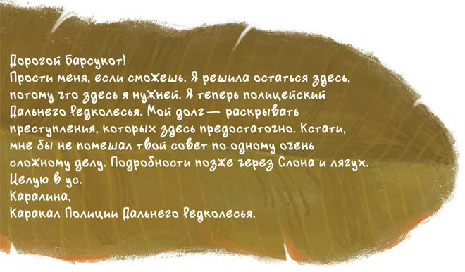 – В чём трагедия? – спокойно спросила я, вцепившись в остатки пелёнки задними лапами и болтаясь вниз головой, потому что передними лапами нацарапывала записку Барсукоту на единственном чистом пальмовом листе, который мне удалось припрятать.