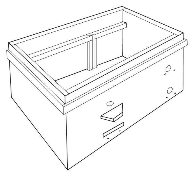 Конструкцию лежаков на 22 рамки скопировали с улья, взятого у опытного пчеловода. В целях экономии материала стенки для улья можно сделать каркасными, используя рейки сечением 25 × 40 мм. На поверхность каркаса стенки, обращенной внутрь улья, нанести клей ПВА, наложить заготовку из листа ДВП и дополнительно закрепить ее оцинкованными гвоздями длиной 20 мм. Пустоты каркаса заполнить пенопластом толщиной 25 мм. На наружную сторону каркаса также на клей закрепить заготовку из фанеры толщиной 8 мм. Высоту стенок сделать с расчетом: подрамочное пространство 4 см + высота рамки 30 см + надрамочное пространство 8 см для укладки утепления и использования кормушек, всего: 4 + 30 + 8 = 42 см.