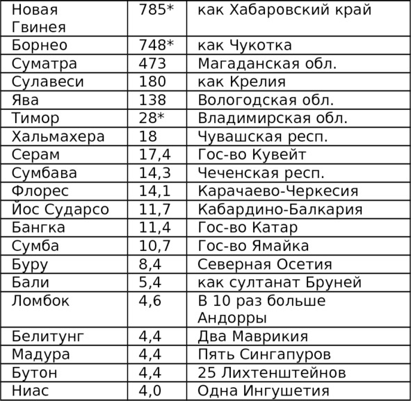 * Острова Новая Гвинея, Борнео (Калимантан) и Тимор не целиком принадлежат Индонезии, а разделены государственной границей; другая часть указанных островов относится к государствам Папуа-Новая Гвинея, Малайзия и Восточный Тимор соответственно.