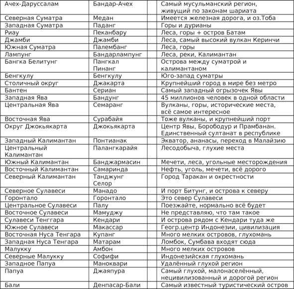 Центр каждой провинции – реально большой город, с разными удобствами для людей: многочисленные банки и банкоматы, почта, магазины, супермаркеты, гостиницы, мечети, церкви; как правило, имеется индуистский и китайский храмы. В столице провинции есть иммиграционный офис, полиция, редакции областных и местных газет, радио, телевидение, университет, представители международного клуба гостеприимства «Couchsurfing», интернет-кафе, относительно крупный аэропорт, рынки и базары, городской транспорт (хотя бы небольшие маршрутки), управление развития туризма, и даже пункт обмена валют (и не один – только написано там «uang asing» или что-то типа этого).