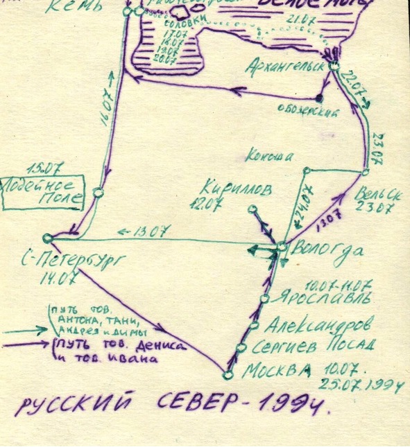 Так прошёл конец 1993 и начало 1994 года. Массовая реклама привела к тому, что собрались ехать целых 48 человек из различных городов. Весной 1994 началась пора практики – люди, как правило, не имели никакого опыта подобных странствий. Провели несколько тренировочных перемещений. В марте – две парных поездки в Пензу с однокурсником Димкой. В начале мая – массовое путешествие более двадцати человек в Питер, очень бестолково мною организованное и поэтому ещё более интересное. Также были и другие небольшие поздки в Питер, Тверь и т.д., в результате которых было «инициировано» около 30 человек. Из них большинство, столкнувшись с трудностями путешествий, на Север ехать не захотели, а многие и вовсе перестали появляться на тусовках.