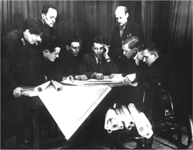 Члены ГИРД обсуждают проект ракетоплана, слева направо: Н. В. Сумарокова, И. П. Фортиков, С. П. Королев, А. Левицкий, Б. И. Черановский, Ф. А. Цандер, Ю. А. Победоносцев, Заботин