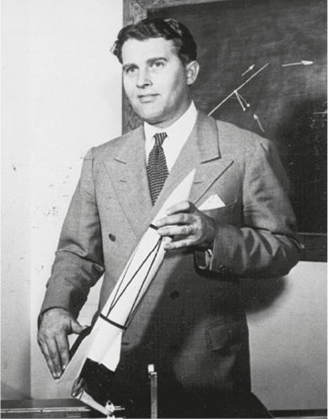 Вернер фон Браун с моделью ракеты «А-4» («V-2») (© NASA)