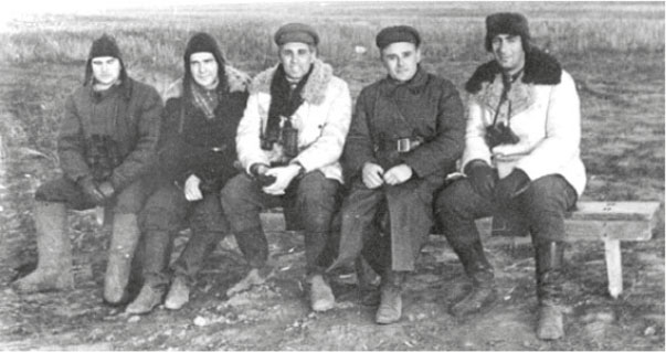 Совет главных конструкторов: В. П. Глушко, М. С. Рязанский, В. П. Бармин, С. П. Королев, В. И. Кузнецов (Капустин Яр, 18 октября 1947 года)