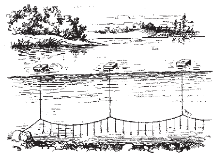 Шнур в толще воды удерживают либо располагающиеся на поверхности буйки, либо поплавки, укрепленные непосредственно на шнур (см. рис. 1).