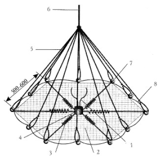 Рис. 3. Подъемник-«зонтик» конструкции Д. Звягинцева: 1 – проволочки для привязывания приманки; 2 – сетное мелкоячеистое полотно; 3 – пружинные распорки; 4 – свинцовый груз весом 100 гр; 5 – стропы; 6 – тяговый шнур, 7 – кольца, 8 – боковая нить.