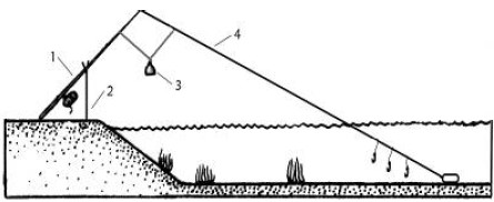 Рис. 5. Донка для весенней ловли голавля: 1 – спиннинг; 2 – подставка; 3 – сторожок-колокольчик (можно не использовать); 4 – основная леска.