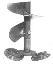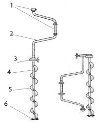 Ручной шнековый ледобур (рис. 1) состоит из ручки (иначе называемой коловоротом), – выгнутой из прочной трубы диаметром 16–20 мм и снабженной двумя рукоятками; из штока (обычно сделанного из чуть более толстой трубы, чем коловорот); из шнека, выбрасывающего наверх ледяную крошку, – верхний конец его приварен к трубке штока, а нижний к одному из держателей ножей; и из режущей части, включающей съемные ножи в количестве двух штук (реже три и более) и их держатели, иногда режущая часть выполняется в виде неразборной, целиком заменяемой насадки.