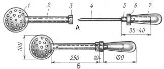 Рис. 8. Черпак-пешня: 1 – черпак; 2 – трубка; 3 – гайка; 4 – стержень; 5 – болт; 4 – кольцо; 7 – ручка.