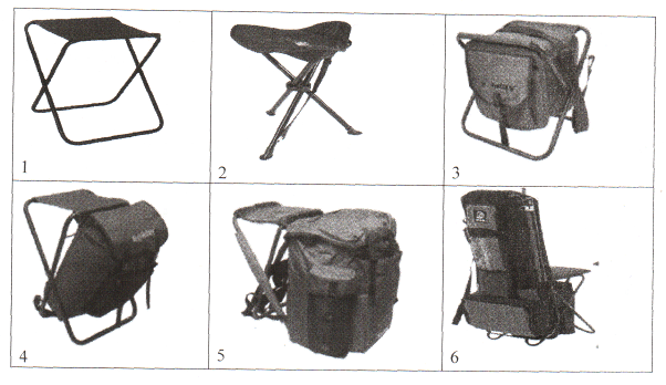 Рис. 15. Современные рыболовные стульчики: 1 – классическая модель; 2 – трехногий; 3 – стул-сумка; 4, 5 – стулья-рюкзаки разной вместимости; 6 – кресло-рюкзак.