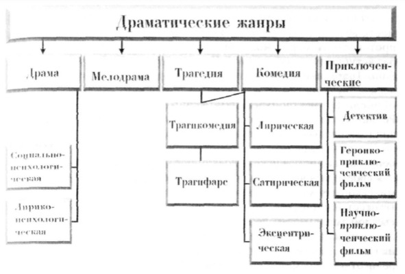 3) сложный жанр (элементы разных жанров составляют новый жанр: трагикомедия, драмакомедия и т.д.)