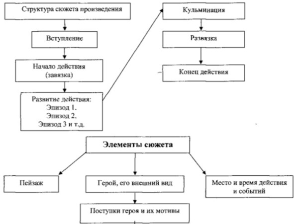 Является формой сюжета. Деление сюжета на: экспозицию, завязку, развитие, кульминацию, финал; их соотнесение и их соединение.