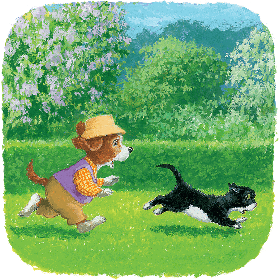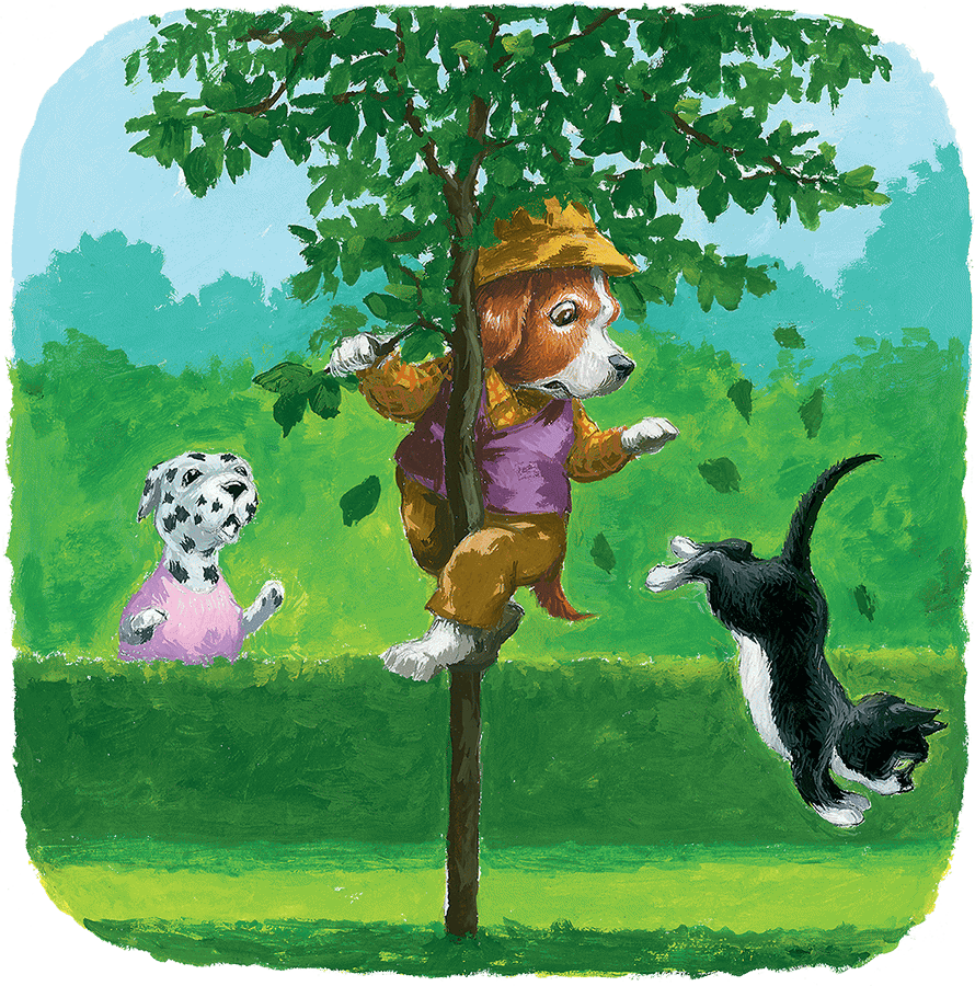 Артос не слушает Бабетку и прыгает всё выше. Ещё чуть-чуть – и схватит кошечку за хвост. Но кошка спрыгнула на землю и бежать.