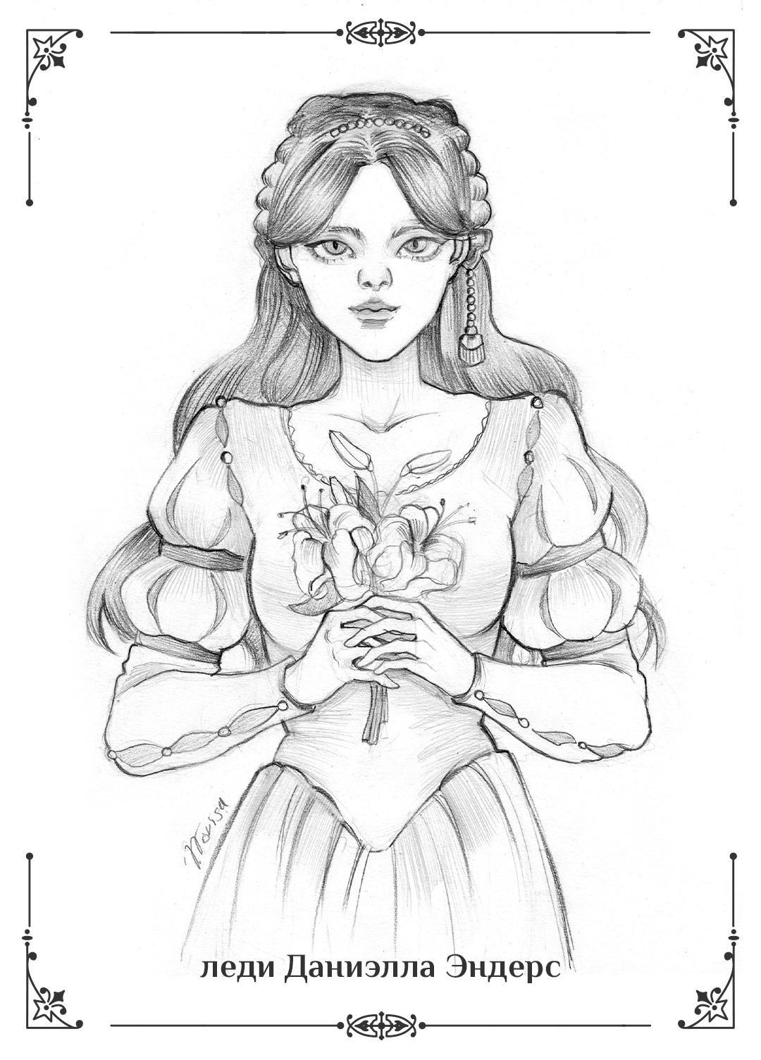 Та была бледна, худее, чем должна была бы быть женщина её роста, да и платье на ней никак не могло принадлежать сестре герцога, до того оно казалось ветхим и неприметным. Чёрная тугая коса, перевитая чёрной же лентой, спускалась через плечо на грудь и ниже до самых коленей. И только это свидетельствовало о благородном её происхождении. Такие же тёмные, ореховые, как у брата, глаза, смотрели настороженно. Многочисленные роды и непосильный труд не оставили на её лице отпечатка ранней старости, но скорбные морщинки в уголках губ и потухший взгляд говорили о непростых годах ― иного проигравшим не оставалось.