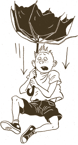 Мы сначала сами немного потренировались, прыгая с пенька, потом принялись забрасывать зонтик Ваське. С двадцатого захода он поймал и раскрыл «парашют», но спрыгнуть забоялся. Лишь когда Павлик в нетерпении завопил: «Ну, прыгай же, трус несчастный!», Васька зажмурил глаза и рухнул вниз… Мы, конечно, разбежались подальше, чтобы он не упал нам на головы.