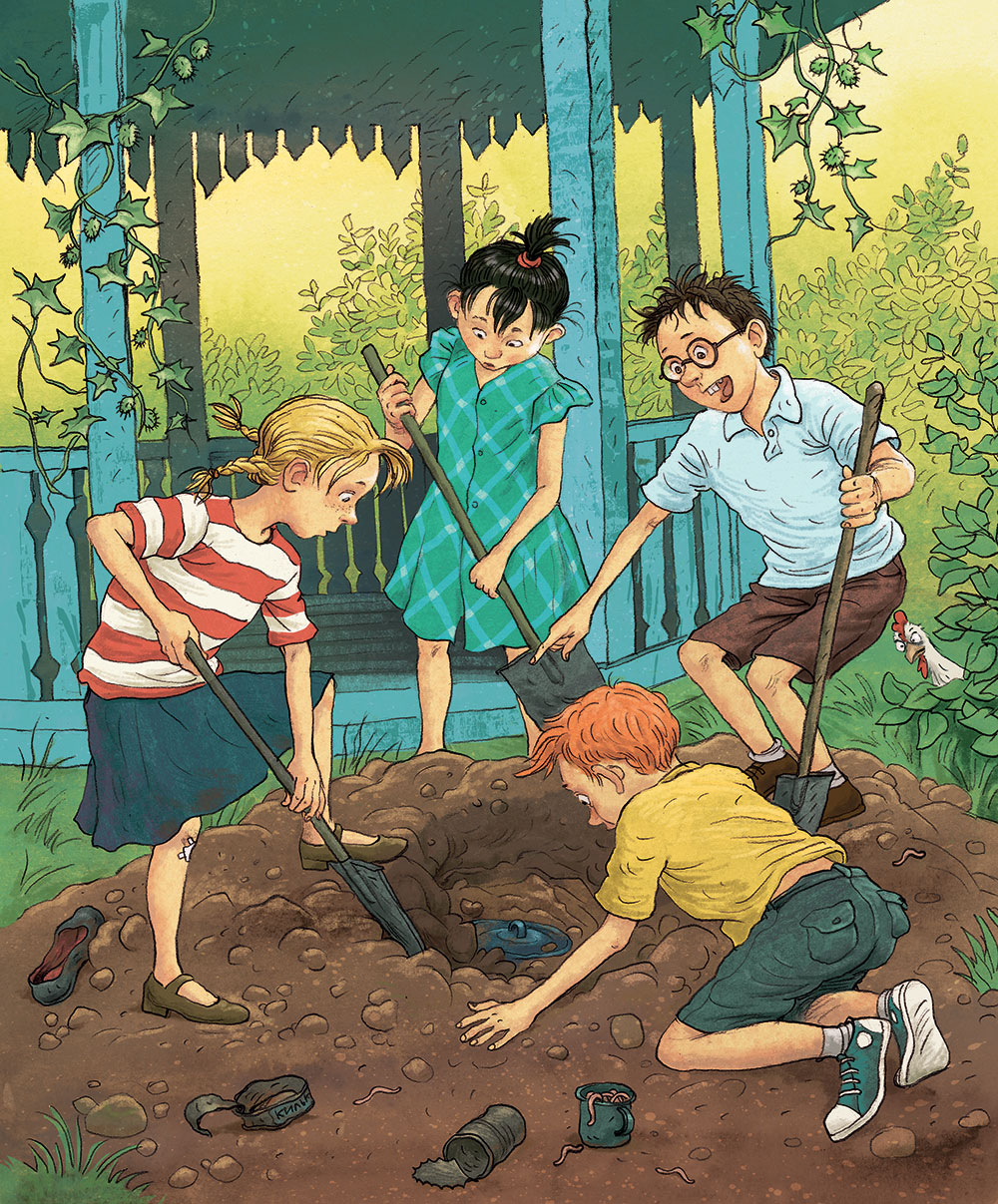 – Клад, клад, – дрожа и вовсю работая лопатой, шептал Павлик. – У меня тонкий нюх на клады… Смотрите, это горшок, он набит золотом…