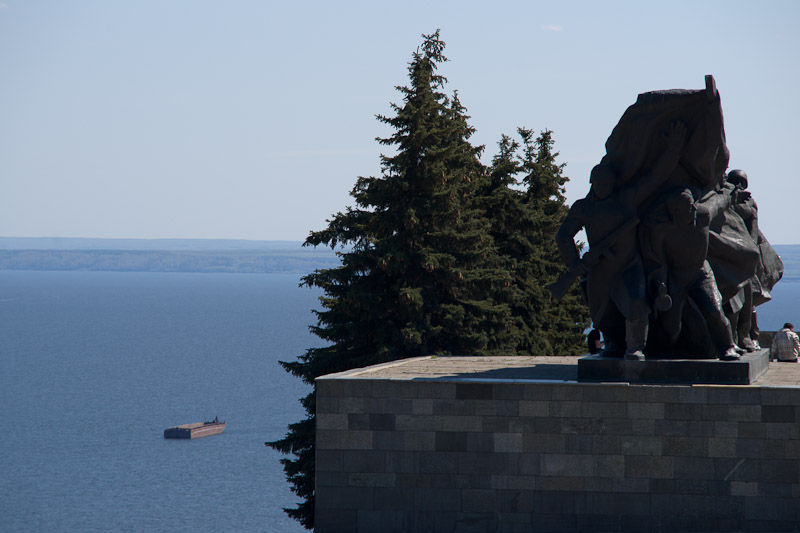 уж очень Волга там широкая. Двинулись дальше, через старый мост, в который теплоход врезался, спуск прямо рядом с местом, изображенным на фото, слева от памятника.
