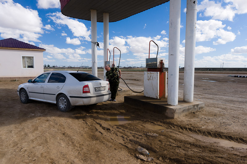 Почти перед границей с Узбекистаном в поселке Акжигит заливаем 20 л солярки в пересчете по $0,60 за литр.