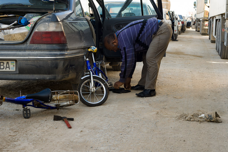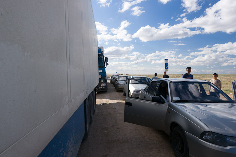 Мы перезнакомились со своими соседями по очереди и поняли, что торчать нам здесь придется долго. Причём ситуация изменилась буквально в этом году. В прошлом году вместо современных пропускных пунктов на казахской и узбекской сторонах были обычные вагончики и дело шло бойко. Потом построили новые КПП, таможню, наняли побольше персонала и всё протухло. Встречные машины с той стороны говорили, что они прошли границу за двое суток.