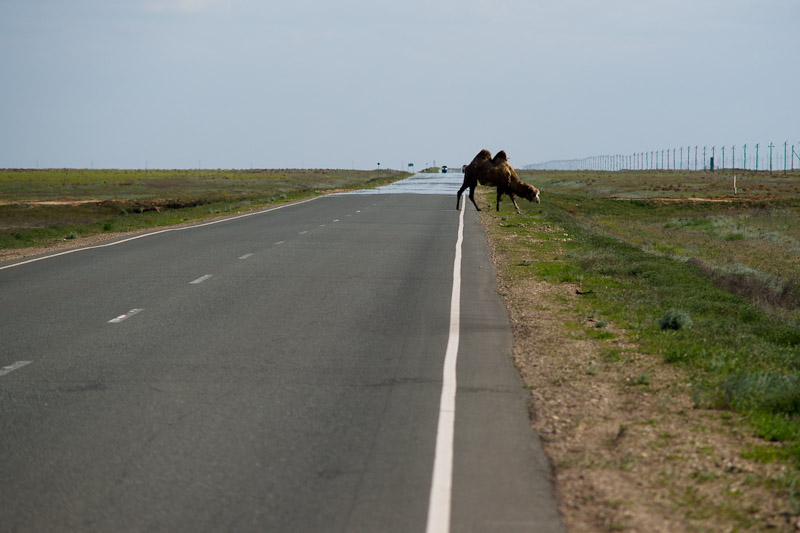 Конечно, на такой дороге Андрей решил проверить скоростные качества своего автомобиля и разогнался до 175 км/час. Именно в этот момент, не раньше и не позже, навстречу нам попался патруль ГАИ на десятке, он развернулся, включил мигалки, догнал нас и велел остановиться. Оказывается, мы проехали знак ограничения скорости 40 км/час, действующий на протяжении 25 км. – ремонт дороги (на обратном пути ремонт здесь действительно был). Таким образом, превышение скорости составило 135 км/час. Не знаю, что бы с нами сделали за это в России, может быть, расстреляли на месте. Андрей отдал 10000 тенге, т.е. $73, все было очень доброжелательно и вежливо. Оказывается, здесь гаишники не прячутся в засаде, не стоят на дороге, а патрулируют её несколькими экипажами, и следят за порядком. После этого мы обратили внимание, что в Казахстане все строго соблюдают ограничение скорости: 110 за городом, значит 110 и дело с концом.