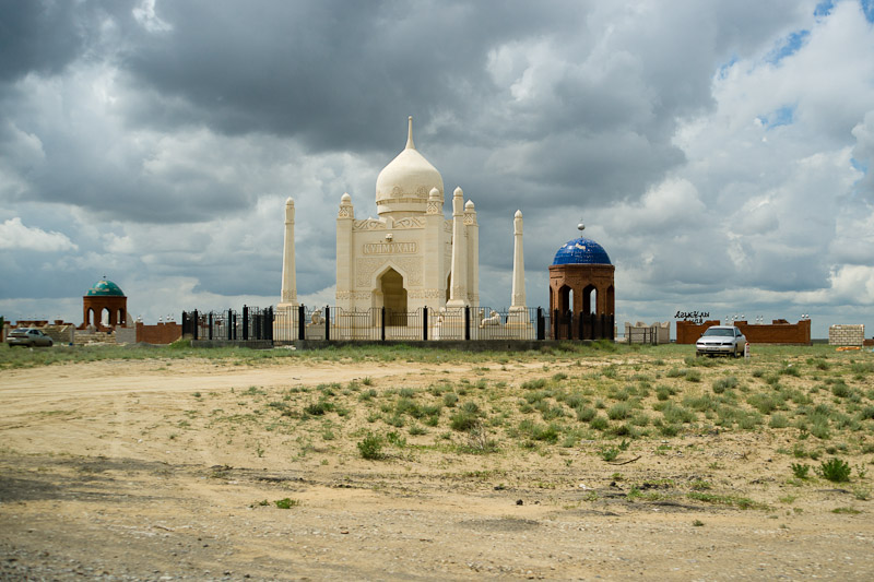 С кладбищами в Казахстане отдельная тема. Строят их как правило в степи, иногда довольно далеко от населенного пункта. Говорю «строят», потому что над каждой могилой строят дом, размеры и качество материалов которого, очевидно, зависит от благосостояния семьи умершего. Вот, наверху на фото, могила какого–то Кулумхана, так это вообще мавзолей, по ходу из мрамора. Естественно, что в любом поселке в одном доме живет несколько человек, а на кладбище каждому полагается отдельное строение, поэтому кладбища выглядят настоящими городами мертвых. Как нам сказали, традиция это не мусульманская, а зороастрийская.