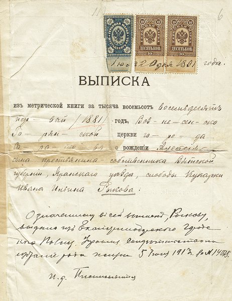 Выписка из метрической книги о рождении А.И. Рыкова 13 февраля 1881 года и крещении