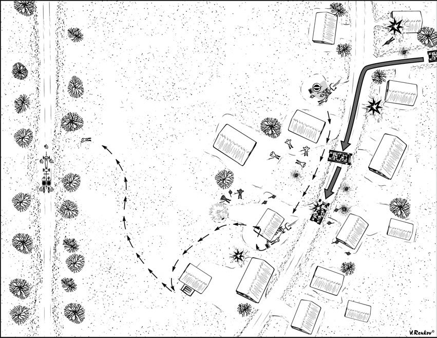 В дверной проем мне был виден стоявший метрах в тридцати круглый, сплетенный из ивовых прутьев курятник. Из-за него высунулся немец, начал что-то кричать. Я взял карабин у Толи Шумилова, поскольку мой остался на передке. И хотя я знал, что стрелять нельзя, чтобы не обозначить себя, но он так нагло кричал, что я не выдержал, прицелился и выстрелил. Немец клюнул носом. Второй, не соображая, подскочил к нему, подставив под мой второй выстрел спину. Из-за курятника начали стрелять. Я спрятался за притолоку. В перестрелке уложил еще двоих. Начал перезаряжать карабин, патрон перекосился, и я, вместо того, чтобы вытащить его, загнал в ствол, таким образом приведя карабин в небоеспособное состояние. Когда я понял, что с карабином мне не справиться, я поднял голову и увидел, что ко мне бегут два немца. Вдруг справа выскочил командир нашего орудия Дыдочкин, остановился перед сараем, начал ковыряться, достал гранату РГД, встряхнул ее, как градусник, и бросил немцам под ноги. Один из них нагнулся, наверное, решив бросить ее обратно, но граната взорвалась у него в руках, и они развалились в разные стороны. А Дыдочкин, пробежав мимо двери, скрылся. Мы решили спрятаться в сарае за железной бочкой. Толя еще как-то за ней поместился, а я нет. Во дворе немцы, что-то кричат… Вдруг в дверях появляется здоровый немец с автоматом. Спрашивает: «Рус, люди есть?» Я думаю, сейчас Шумилов застонет – он стонал до этого – немец полоснет, и все, и кончатся мои денечки в этом чертовом сарае, но тут последовала команда и немец исчез. Через некоторое время немцы во двор притащили своих раненых, которых вскоре увезли. Бой стал затихать. Я говорю: «Толя, надо уходить». – «Надо, Витя. Пошли?» – «Пошли». Лежим, проходит некоторое время. Я говорю: «Пошли?» – «Пошли». Мы опять лежим. Когда я ему в третий раз сказал: «Ну, пошли». Он меня спросил: «Витя, ты куда ранен?» – «В ногу». – «В одну?» – «В одну». – «А я в две. Так что тебе идти первому». – «Хорошо». Выполз я из сарая, а поскольку был в шинели (ситцевый белый маскхалат был страшно неудобный, и мы его не одевали), решил для маскировки обваляться в снегу. Покатался по снегу – бесполезно. Шинели были добротными – никакой снег не приставал. Поняв всю бессмысленность затеи, встал на коленки и побрел. Добрался до курятника, в сторону убитых старался не смотреть – страшно. Повернул левее в сторону кирпичного здания, возле которого виднелась копна сена. Подле этой копны, в свете горящих построек села, я увидел сидящего старика. Одна женщина сидела перед ним на коленях, а вторая как маятник ходила неподалеку и стонала. Я спросил, что произошло. Оказалось, что эта семья сидела в погребе. Какой-то немец, подняв крышку люка, спросил: «Рус, люди есть?» Они ему снизу отвечают: «Е. Тут мирные жители». Он взял и бросил туда гранату. Старуху убило. Деда сильно ранило, а женщине, что ходила, покалечило грудь. Только одна осталась невредимой, а может, просто не почувствовала еще, находясь в шоке. Я у них спрашиваю: «Немцы впереди есть?» – «Е». – «А слева?» – «Есть». – «А сзади?» – «Есть. Они всюду». Тогда я их попросил переодеть меня в гражданскую одежду и спрятать, пока придут наши. На что получил в ответ: «Какое нам дело до вас?» Ну, подумал я, надо уходить, иначе сдадут. Кстати, Толя, которого я потом встретил в госпитале, рассказал, что, выждав с полчаса, он пополз по моему с
