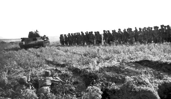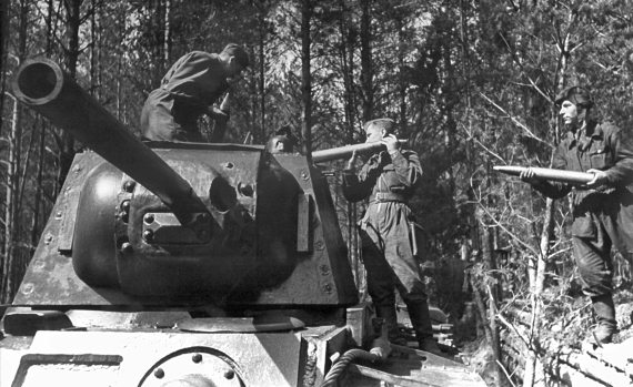 Подготовка бойцов мотострелкового батальона к отражению танковой атаки. Преодаление так называемой «танкобоязни» было одним из необходимых элементов обучения пехотинцев. В качестве немецкого танка используется «Т-40»