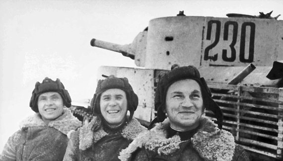 Экипаж танка «Т-28» у своей боевой машины. Ленинградский фронт. Зима 1942 года