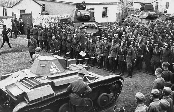 Митинг в танковой части. Весной 1942 года стандартным вооружением танковых бригад были танки «КВ-1», «Т-34» и «Т-60»