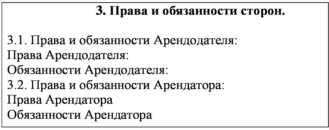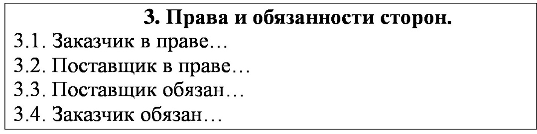 В данном разделе договора указываются основные права и обязанности сторон. Для удобства они прописываются отдельно, для каждой стороны. Это исключает необходимость постоянного указания стороны договора, чьи права и обязанности указываются в пункте договора.