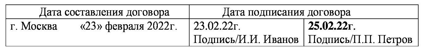 Важное: дата составления договора может быть отличной от даты его заключения, подписания одной из сторон. Если стороны указывают дату подписания договора, то в данном случае договор вступает в силу с даты, указанной у подписи стороны, подписавшей договор в последнюю очередь.