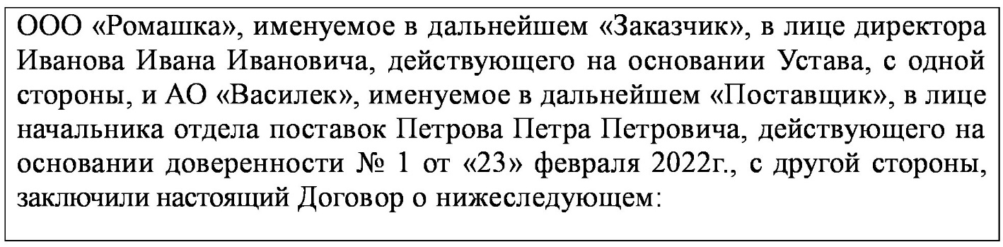 Например, ООО «Ромашка», именуемое в дальнейшем «Заказчик», в лице директора Иванова И. И, действующего на основании Устава.