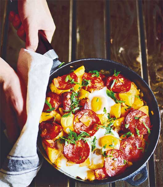 Добавьте картофель и готовьте все вместе 5 минут, перемешивая, но аккуратно, чтобы не разрушить вареный картофель, затем разбейте сверху яйца.