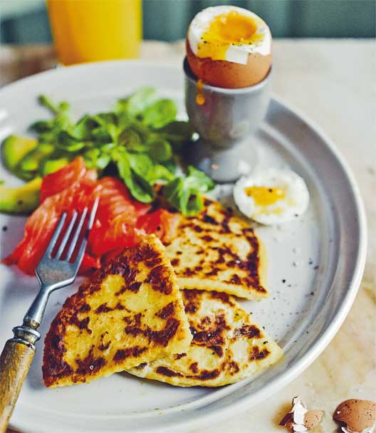 Сварите яйца. Сервируйте лепешки, положив сбоку лосось и яйца.