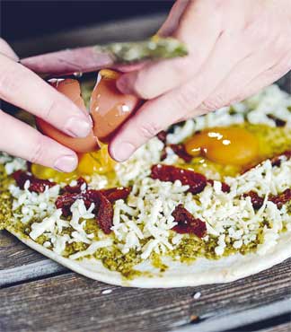 Положите на пиццу тонкий слой песто, затем разложите ровным слоем вяленые томаты, посыпьте все сыром. Сделайте небольшие углубления в слое сыра и разбейте в них яйца.