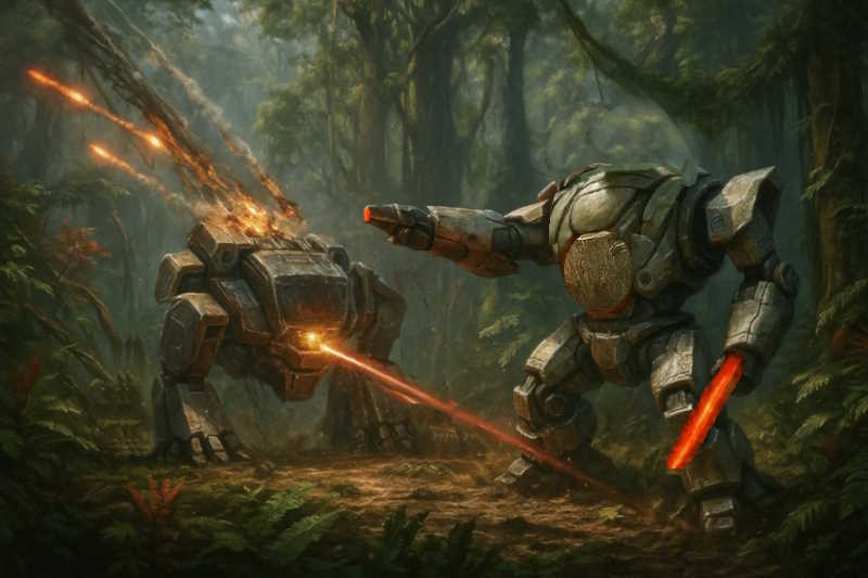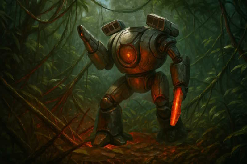 Лианы будто живых и все понимающих деревьев настырно лезли в «лицо» и закрывали сенсоры боевой машины, мешая быстрому движению вперед. Ноги 4.5-метрового 35-тонного мех-доспеха «Охотника» путались в них не в силах сохранить нужный темп движения. Машина то и дело совершала остановки, крутила торсом, опасаясь внезапного удара со стороны, давая живой гибкой поросли опутать себя. Убеждаясь в тишине и безопасности боевой робот продолжал движение вперед, и все повторялось снова. Он с усилием полимерных волокон-«мускул» с треском рвущихся лиан вырывал собственные конечности у настырной и агрессивной природы. Его термо-ударный клинок с остервенением прорубал путь вперед, разрезая раскаленным жалом ненавистную паутину из лиан, ветвей и кореньев. Природа Найромы сопротивлялась каждому новому шагу боевой машины, не давая той выйти, наконец, к долгожданному плато где-то на окраине плотно поросшего склона пологого холма. Можно было срезать через разрезающий джунгли крутой и глубокий овраг, но пилот который вел машину, посчитал этот маневр слишком рискованным для себя.