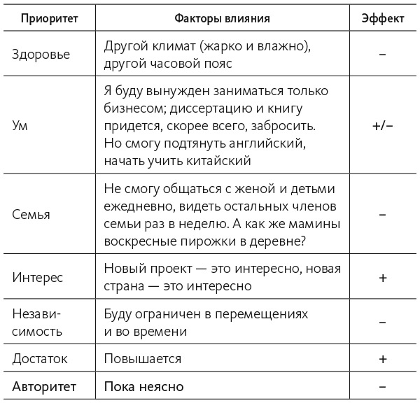 Ранжирование приоритетов помогает принимать решения, которые меняют вашу жизнь. Например, вам предлагают новый бизнес-проект, который потребует немедленного отъезда в Сингапур и на котором вы гарантированно заработаете 10 миллионов долларов в год (то есть измените свою жизнь в материальном плане радикально). Вроде бы все очень привлекательно! Конечно, надо соглашаться!