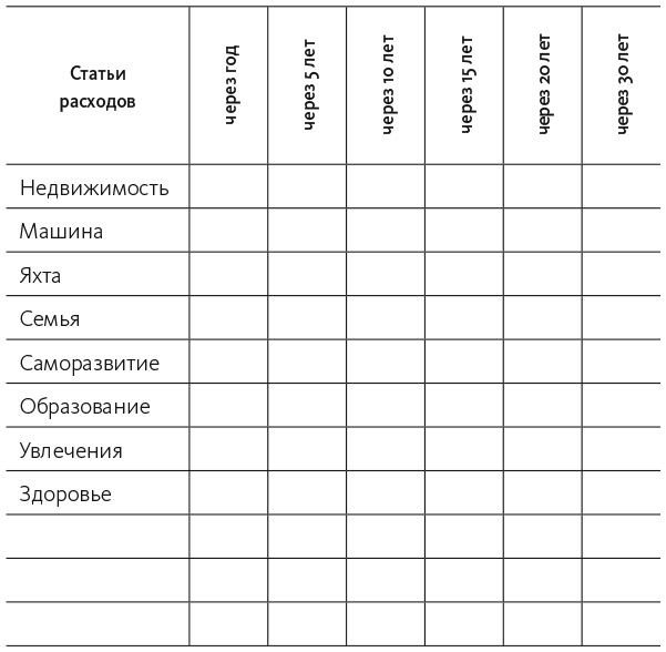 • На что потратите деньги? Обычно все заканчивается на уровне «машина, квартира и шуба жене (себе)». Заполняем следующую таблицу (табл. 1.5). Крайне важно понимать, сколько денег и для каких целей вам необходимо.