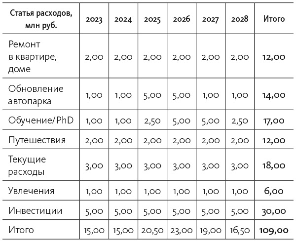 Для тех, у кого не получилось заполнить последнюю таблицу, приведу свой пример (табл. 1.6). Чтобы не шокировать вас своими планами на 30 лет, я привожу период с 2023 по 2028 год.