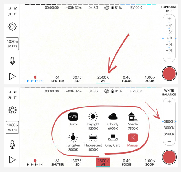 Приложение Pro Movie. Тапните по иконке WB в нижней части экрана и при помощи шкалы справа (помечено стрелочкой) настройте нужный вам баланс белого. В открывшимся окне по центру можно выбрать как автоматический режим AWB, так и один из заранее предустановленных сценариев